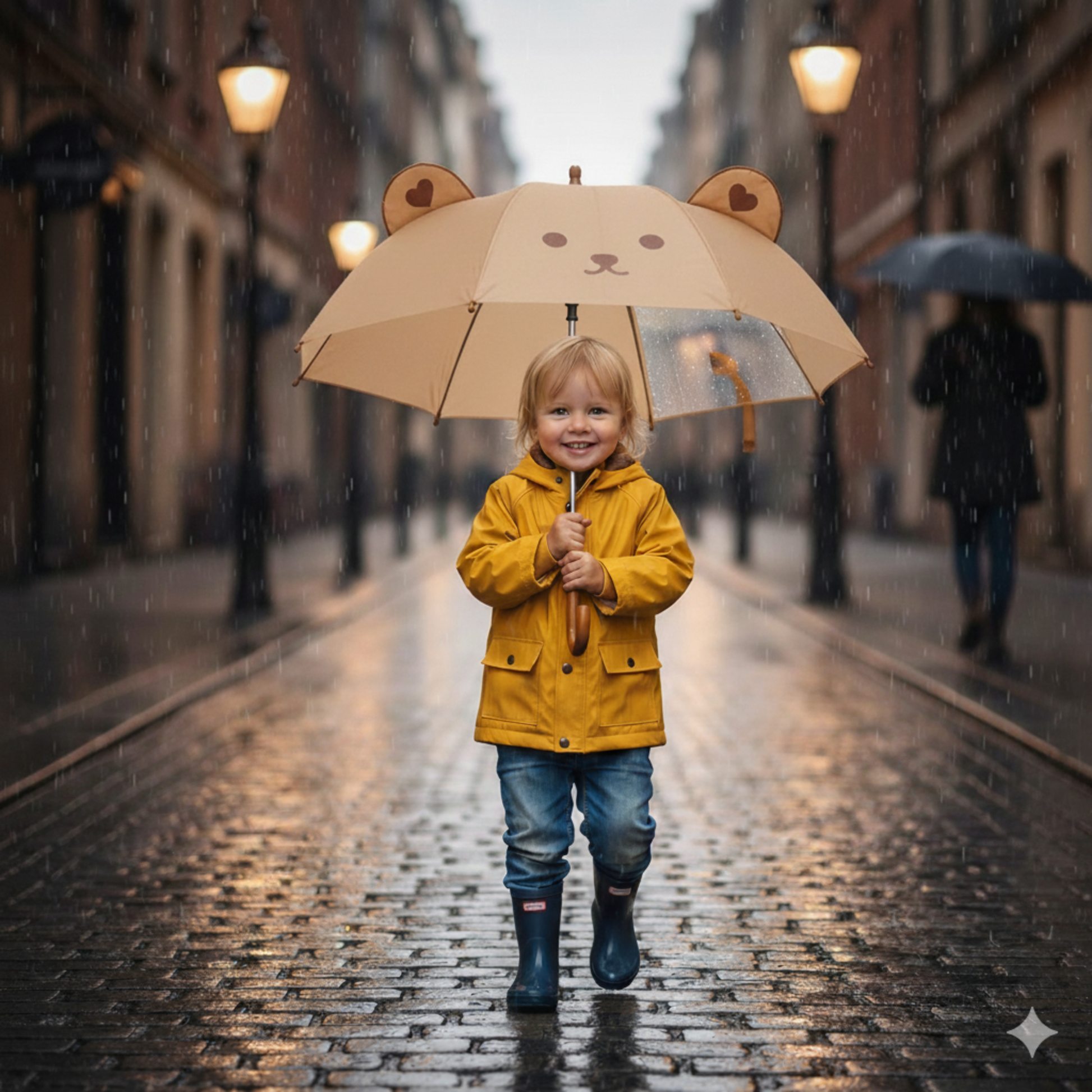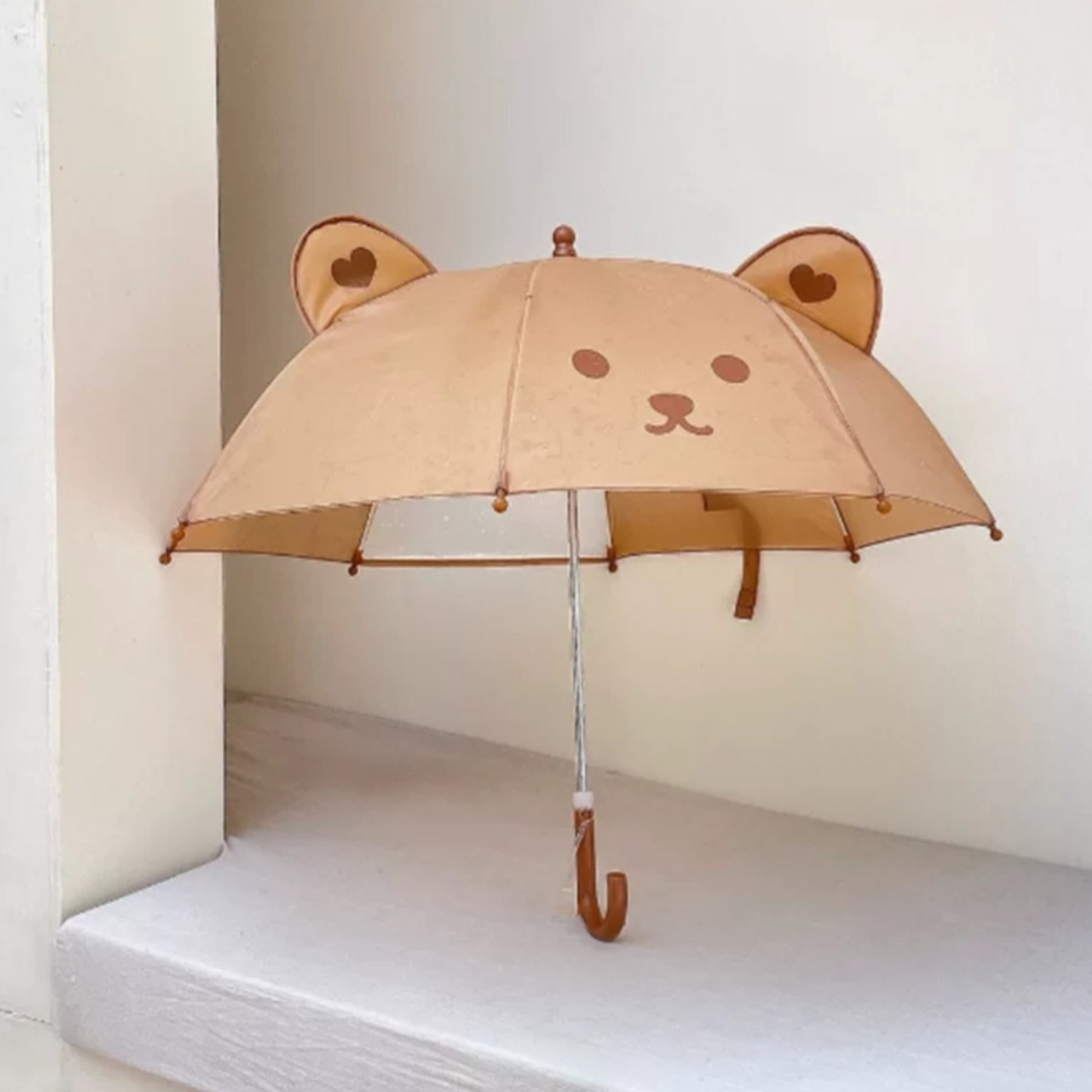 Sein handliches Design mit kleinen Bärenohren ist perfekt für Kinderhände und leicht zu bedienen. Der wasserabweisende Stoff schützt zuverlässig vor Regen, während das stabile Gestell Sicherheit und Langlebigkeit bietet.