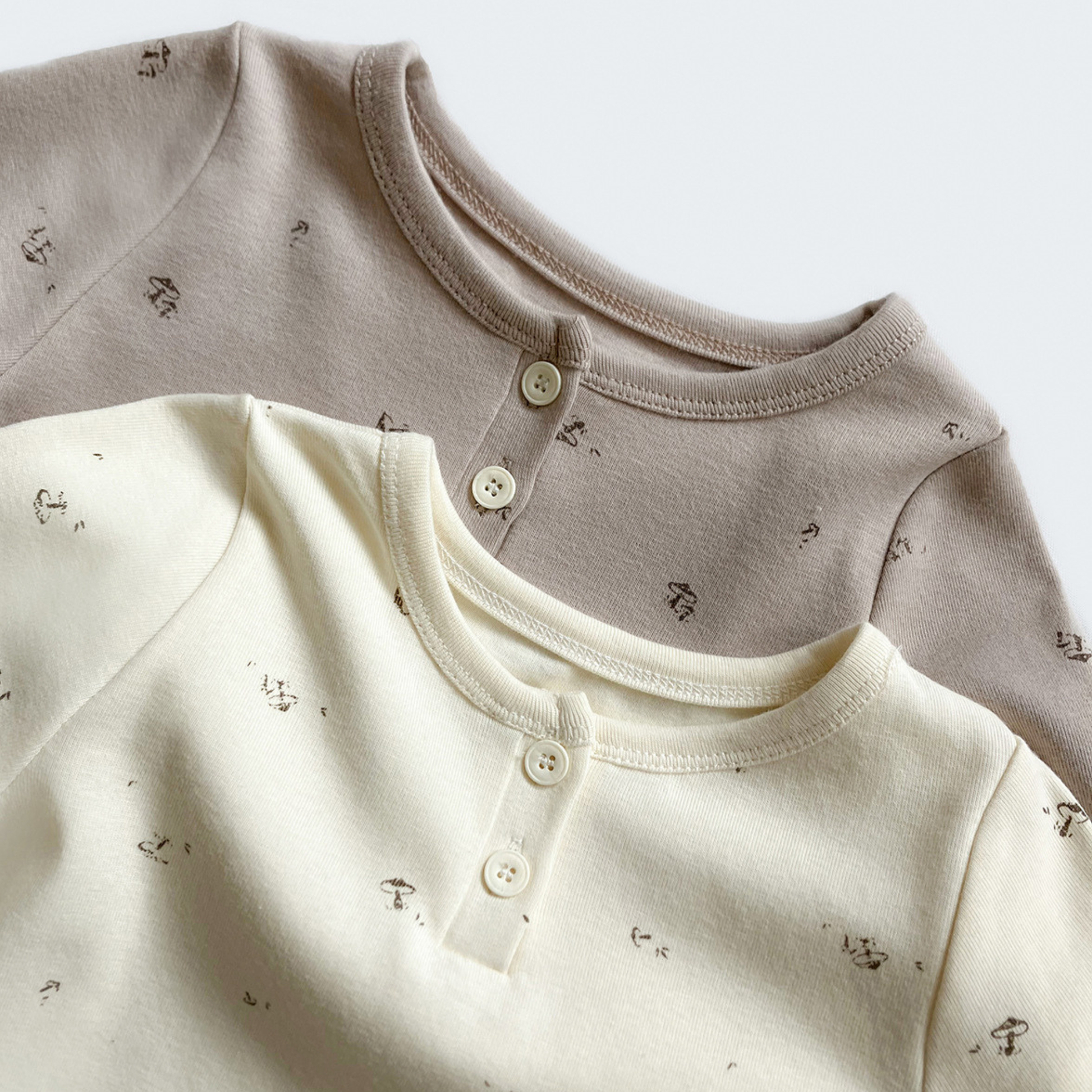 Das Oberteil ist mit einem dezenten Allover-Print gestaltet und verfügt über einen Rundhalsausschnitt mit kleiner Knopfleiste. Die passende Hose sitzt bequem und engt nicht ein.